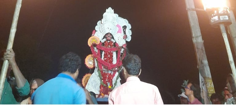 পুজোর পরের দিন কালী গ্রাম আরো আকর্ষণীয় হয়ে ওঠে। আলো নিভিয়ে দেওয়া হয় গোটা গ্রামের। জ্বালানো হয় মশাল। বাঁচতে থাকে ঢাক-ঢোল-কাঁসর-ঘন্টা। এরপর বড়, মেজো, সেজো আর ছোট মা চতুর্দোলায় করে গ্রামে ঘুরতে বের হন। সারারাত ভক্তদের কাধে চড়ে নাচতে নাচতে এলাকা প্রদর্শন করেন তিনি। বিসর্জনের আগে চার বোন মিলিত হয় জমিদার পাড়ায়