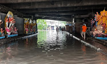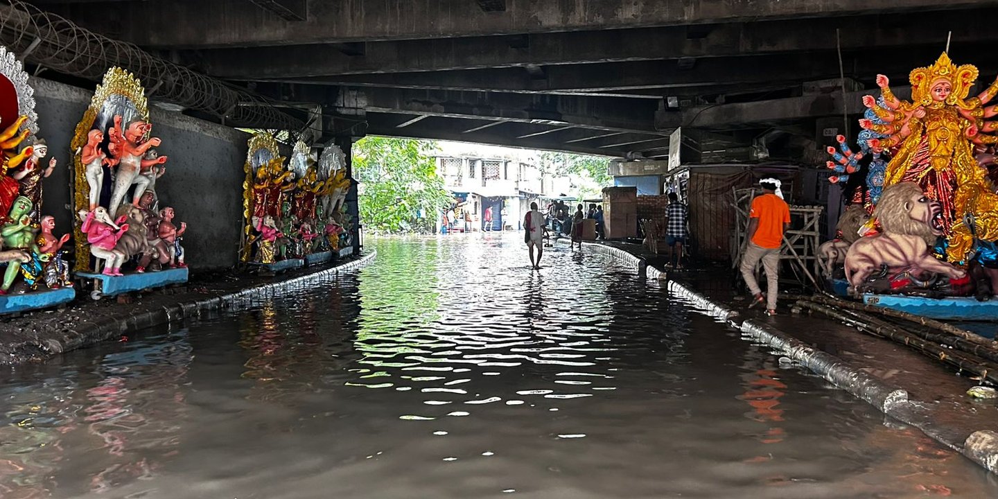 মহালয়ার আগে থেকেই পুজো উদ্বোধন শুরু হয়ে গিয়েছে। ভিড় হওয়ার আগেই ভিড় এড়িয়ে টুপ করে ঠাকুর দেখে নেওয়ার কৌশল নিয়েছে অনেকেই। কিন্তু সোমবার রাতে প্রবল বৃষ্টি সবকিছু লণ্ডভণ্ড করে দিয়েছে। পুজো মণ্ডপগুলো পুকুরে পরিনত হয়েছে। রাস্তায় জল জমে গিয়েছে। বর্ষার জলে শুধু ঠাকুর তৈরি বন্ধ হয়ে যায়নি অনেক জায়গায় ক্ষতিও হয়েছে প্রতিমার। উঁচু জায়গাতে সরিয়ে ফেলা হচ্ছে মূর্তিগুলো। মণ্ডপেও ক্ষতিগ্রস্ত হয়েছে শেষ মূহুর্তের কাজ। এদিকে এমন অবস্থায় পুজোর বাজারও থমকে গিয়েছে সব মিটিয়ে বৃষ্টিসুরের তাণ্ডবে আশঙ্কায় বাঙালি